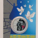 75 лет Победы во Второй мировой войне. Цветная эмаль. Маки, голуби. стилизованные изображения силуэта советского солдата на фоне рассеченной трещинами стены, символизирующей разрушения принесенные войной.