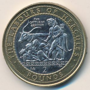 KM#764 Гибралтар, 2 фунта Биметалл, 28.4 мм, 12.05 г Категории: Выдающиеся личности, Искусство, Животные, Юбилейные. Десятый подвиг: Похищение коров трёхголового великана Гериона. Серия: «Подвиги Геракла». Информация о выпуске (подробности в каталоге):