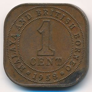 KM#5 Малайя и Британское Борнео, 1 цент Бронза, 4.27 г Категории: Необычная форма. Аверс: Елизавета II. Информация о выпуске (подробности в каталоге):