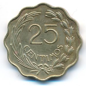 KM#27 Парагвай, 25 сентимо Алюминий-Бронза, 23 мм, 5.3 г Категории: Необычная форма. Информация о выпуске (подробности в каталоге):