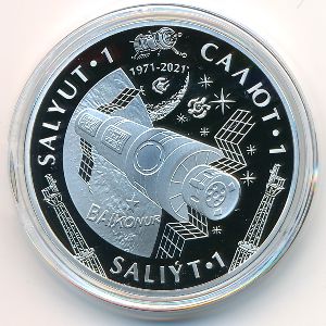 Казахстан, 200 тенге Мельхиор, 33 мм, 15 г Категории: Космос, Транспорт, Юбилейные. Реверс: в центре изображение орбитальной космической станции «Салют-1» на фоне Земли с видом из космоса. На поверхности Земли звезда и надпись BAIKONUR на английском языке. По окружности – название монеты на государственном, русском и английском, а также надпись «1971-2021», обозначающая юбилейную дату события. Аверс: изображение композиции, символизирующей единство человека и вселенной. В правой части монет надпись, обозначающие номинал монеты, в левой герб Казахстана. В нижней части – логотип Казахстанского монетного двора. По окружности – надписи «QAZAQSTAN RESPÝBLIKASY» и «REPUBLIC OF KAZAKHSTAN». Информация о выпуске (подробности в каталоге):