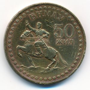 KM#34 Монголия, 1 тугрик (1971 г.) Алюминий-Бронза, 32 мм, 14.9 г Категории: Без тематики, Юбилейные. 50-летие революции. Памятник Сухе-Батору в Улан-Баторе(1946 г.). Смотрите подробное описание типа в каталоге.