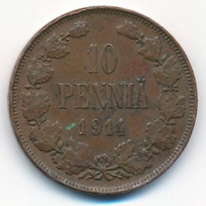 KM#14 Финляндия, 10 пенни (1914 г.) Медь, 30 мм, 12.8 г Категории: Без тематики. Николай II. Смотрите подробное описание типа в каталоге.